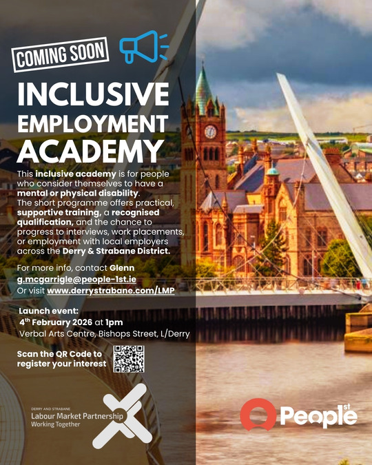 A new Derry Inclusive Employment Academy is set to launch across the Derry & Strabane District Council area, providing practical, tailored support for residents who consider themselves to have a mental or physical disability and who are ready to move into employment. The programme will support participants into roles within the IT, Finance and Creative Media sectors, offering recognised qualifications and clear progression routes towards interviews, work placements, and local employment opportunities.
